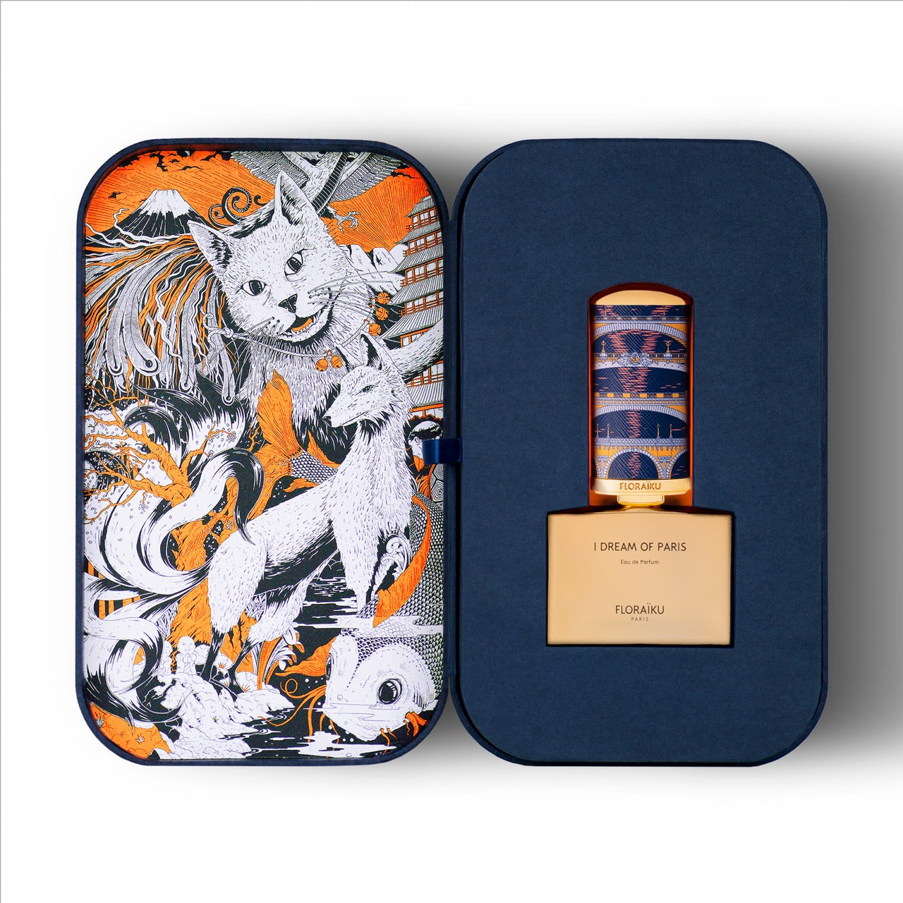 Paris will always be Paris. Its monuments remain etched in one’s heart and mind forever. I Dream of Paris pays tribute to the beauty of the city of light in a golden bottle, witness to its brilliance, its golds, its majesty. In the distance, the Eiffel Tower sparkles, like an emotion still intact. Her long silhouette reflected by the Seine, its eternal mirror. The dance of the bridges over the river, the curve of which calls for the caress, the murmur. They are there, on the cap of the bottle, delicate patterns to celebrate Paris, where Floraïku was born.