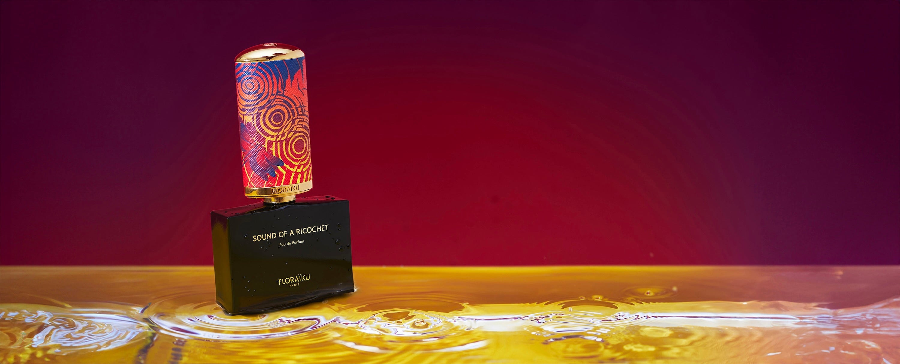 The red dragonfly under a burning sky that appears in the haiku of the perfume, is reflected in a golden ricochets mirror. The trace of perfect circles on the surface of water, that seem so pure and delicate, symbolize the structure of the composition.